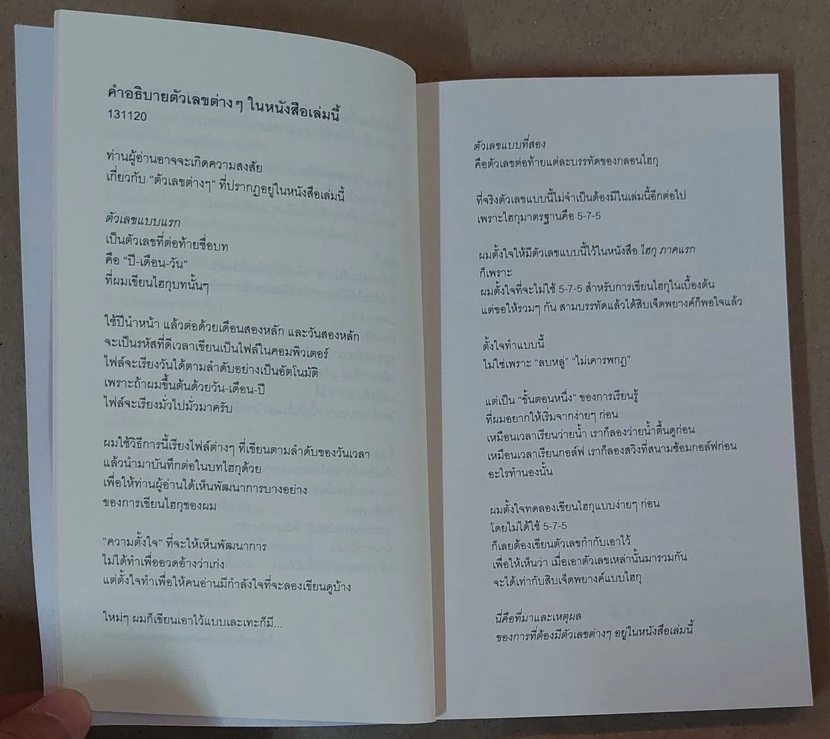 ผมตั้งใจให้มีตัวเลขแบบนี้ไว้ในหนังสือ ไฮกุ ภาคแรก ก็เพราะผมตั้งใจที่จะไม่ใช้ 5-7-5 สำหรับการเขียนไฮกุในเบื้องต้นแต่ขอให้รวมๆ กัน สามบรรทัดแล้วได้สิบเจ็ดพยางค์ก็พอใจแล้ว
