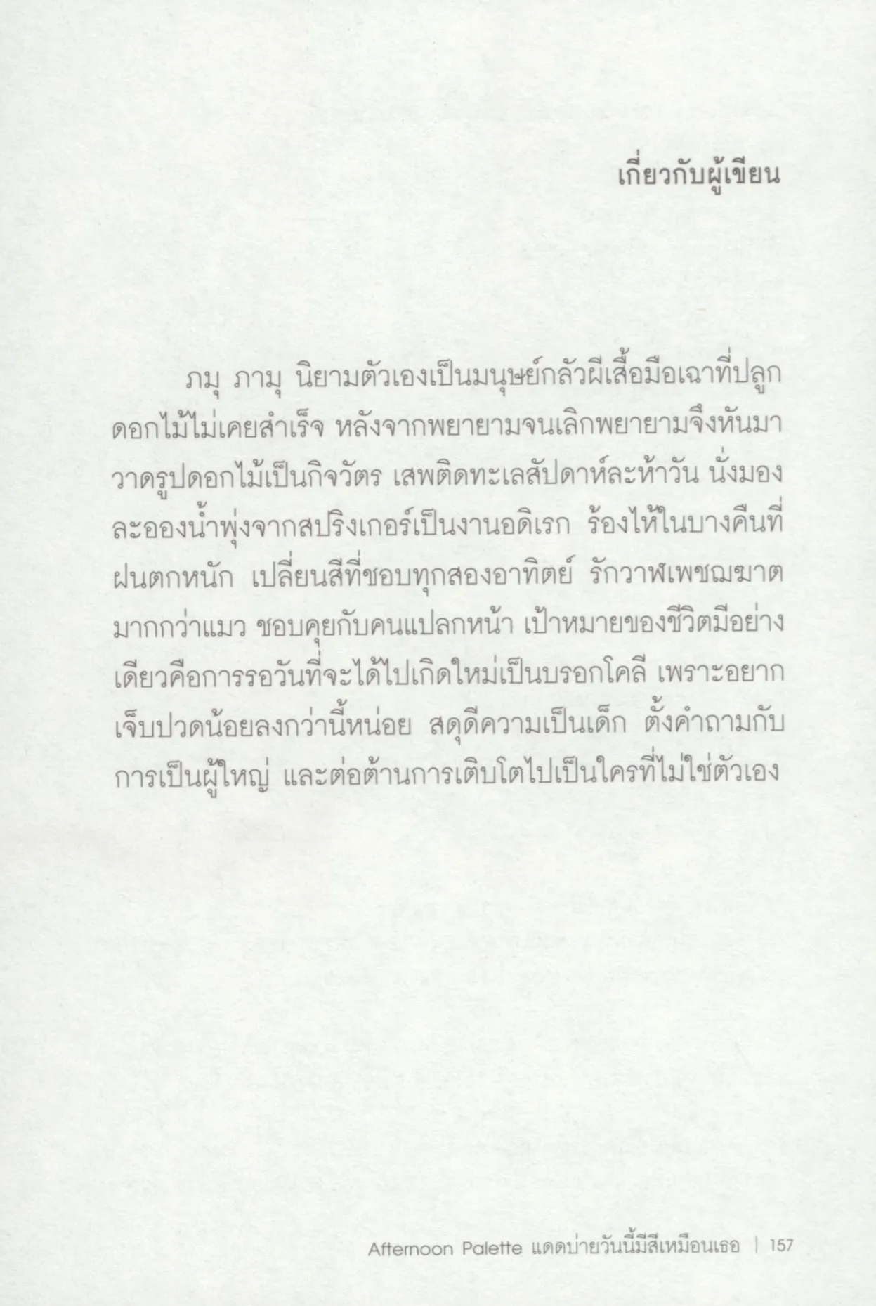 ภมุ ภามุ นิยามตัวเองเป็นมนุษย์กลัวผีเสื้อมือเฉาที่ปลูกดอกไม้ไม่เคยสำเร็จ หลังจากพยายามจนเลิกพยายามจึงหันมาวาดรูปดอกไม้เป็นกิจวัตร เสพติดทะเลสัปดาห์ละห้าวัน นั่งมองละอองน้ำพุ่งจากสปริงเกอร์เป็นงานอดิเรก ร้องไห้ในบางคืนที่ฝนตกหนัก เปลี่ยนสีที่ชอบทุกสองอาทิตย์ รักวาฬเพชฌฆาตมากกว่าแมว ชอบคุยกับคนแปลกหน้า เป้าหมายของชีวิตมีอย่างเดียวคือการรอวันที่จะได้ไปเกิดใหม่เป็นบรอกโคลี เพราะอยากเจ็บปวดน้อยลงกว่านี้หน่อย สดุดีความเป็นเด็ก ตั้งคำถามกับการเป็นผู้ใหญ่ และต่อต้านการเติบโตไปเป็นใครที่ไม่ใช่ตัวเอง