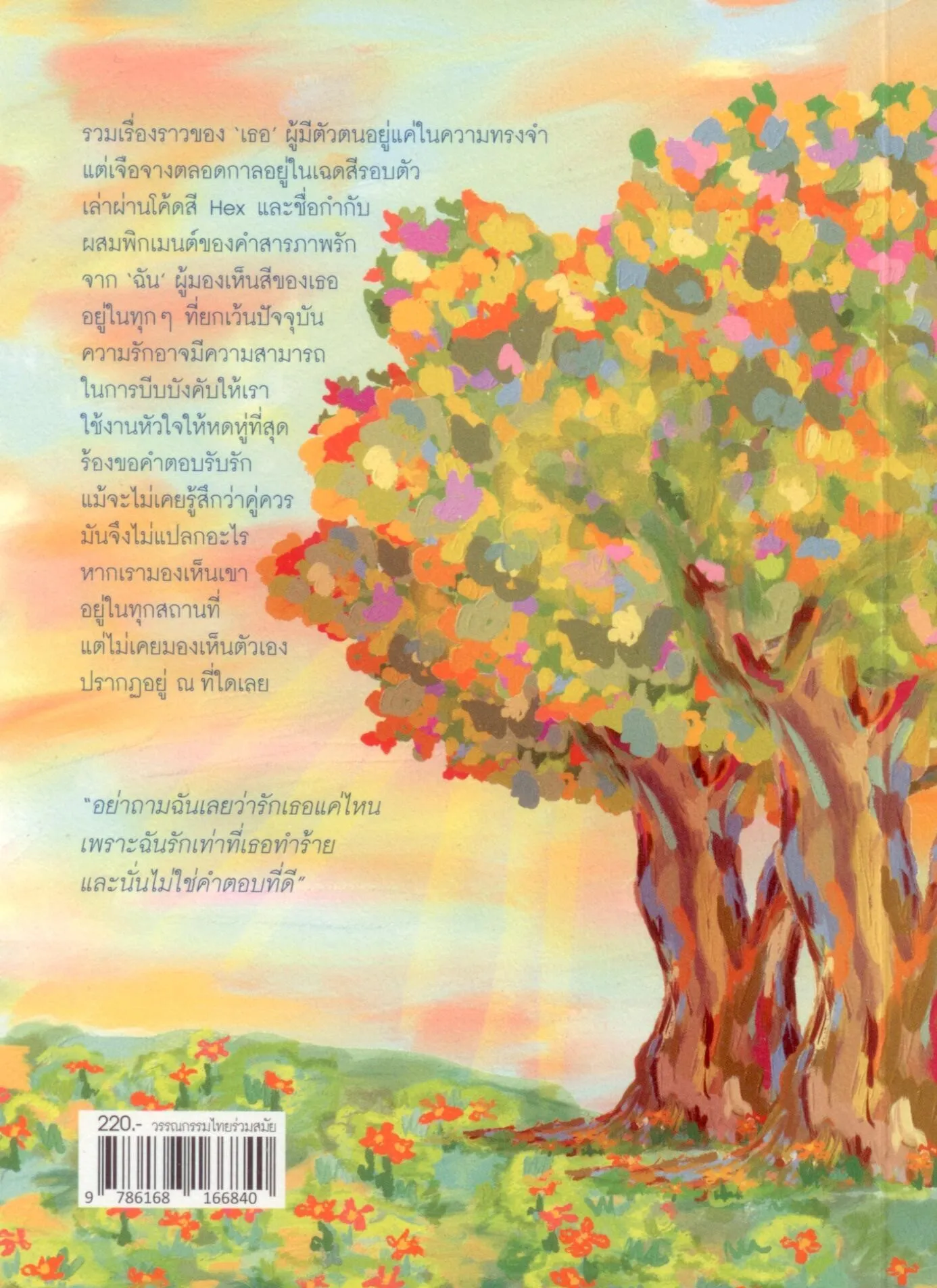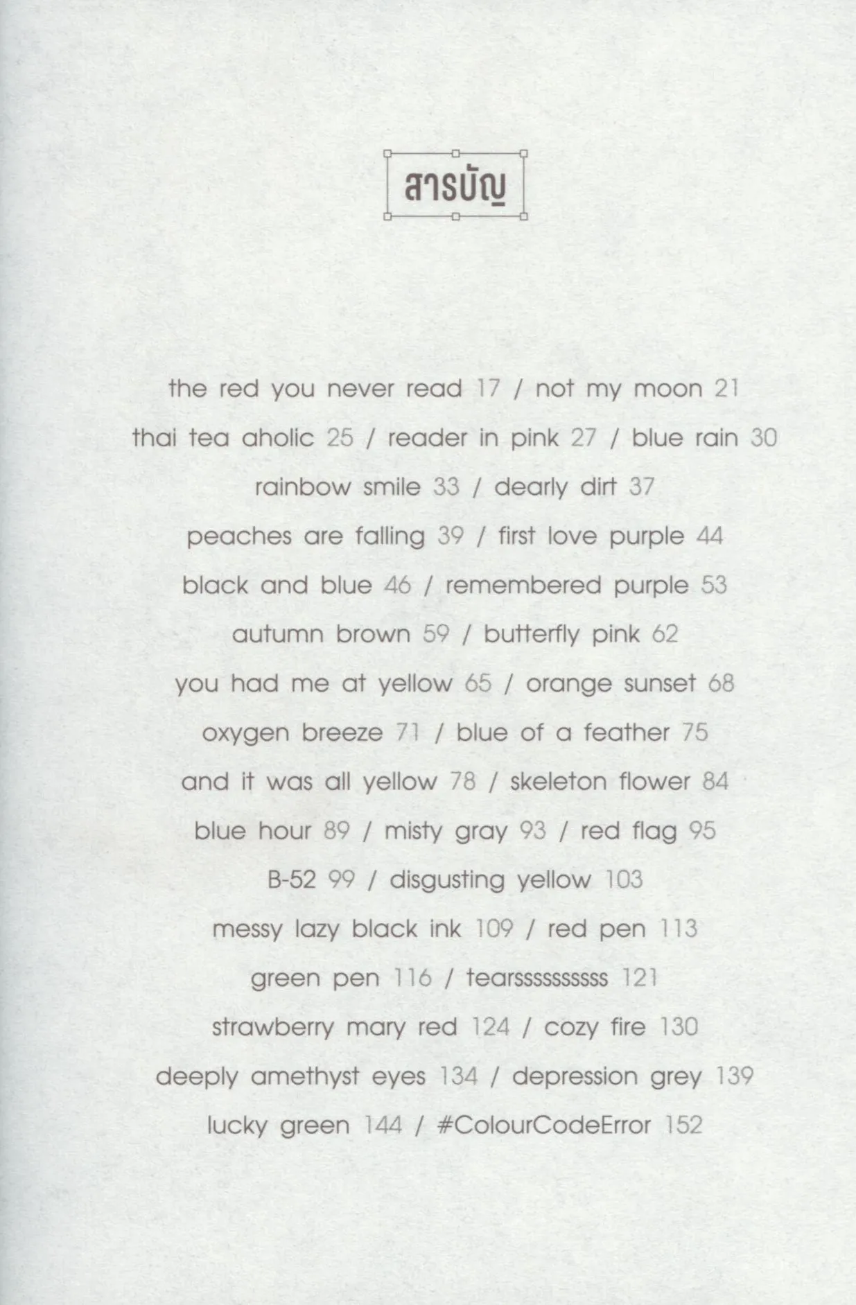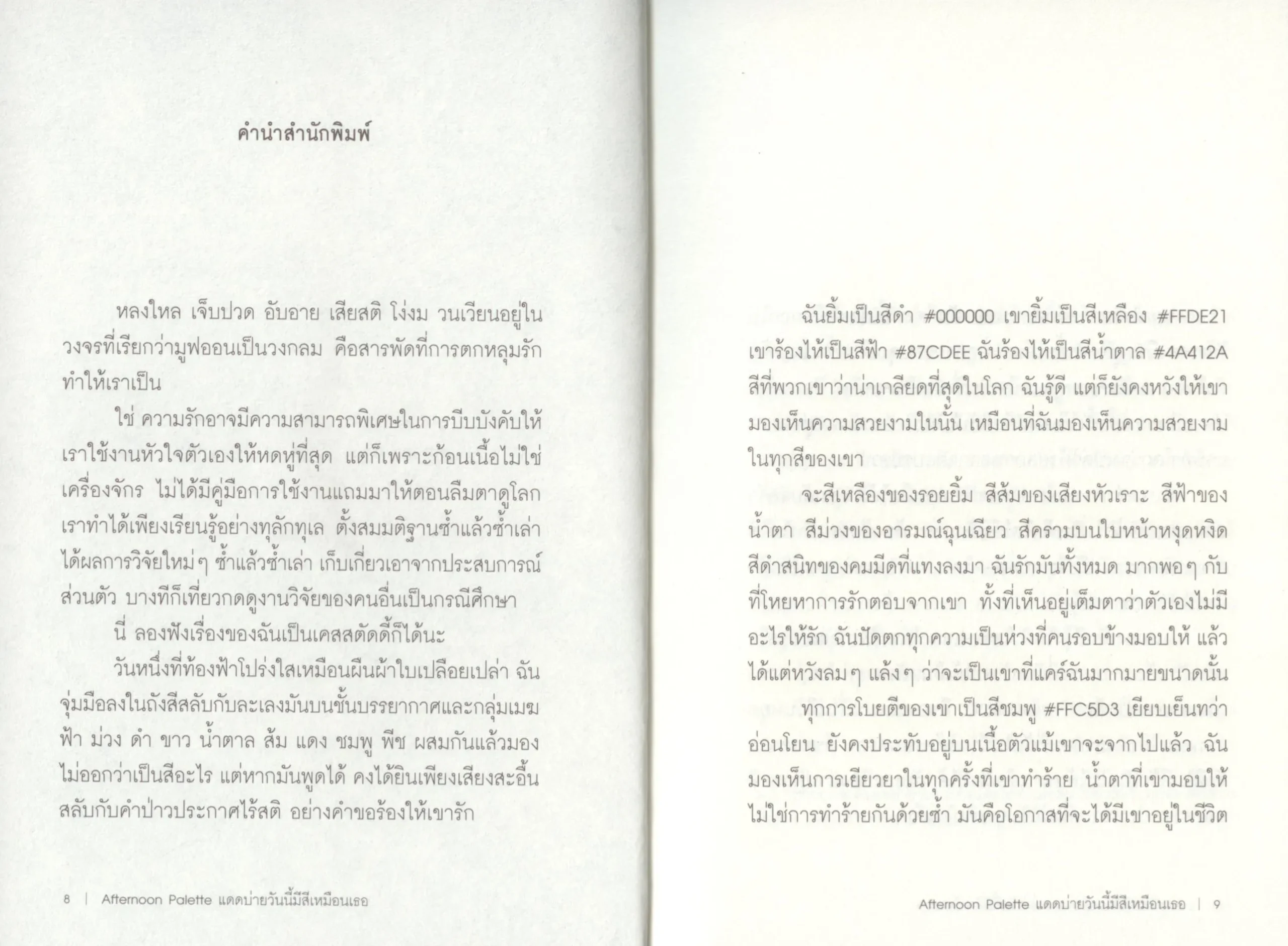 รวมเรื่องราวของ ‘เธอ’ ผู้มีตัวตนอยู่แค่ในความทรงจำ แต่เจือจางตลอดกาลอยู่ในเฉดสีรอบตัว เล่าผ่านโค้ดสี Hex และชื่อกำกับ ผสมพิกเมนต์ของคำสารภาพรักจาก ‘ฉัน’ ผู้มองเห็นสีของเธออยู่ในทุกที่ยกเว้นปัจจุบัน