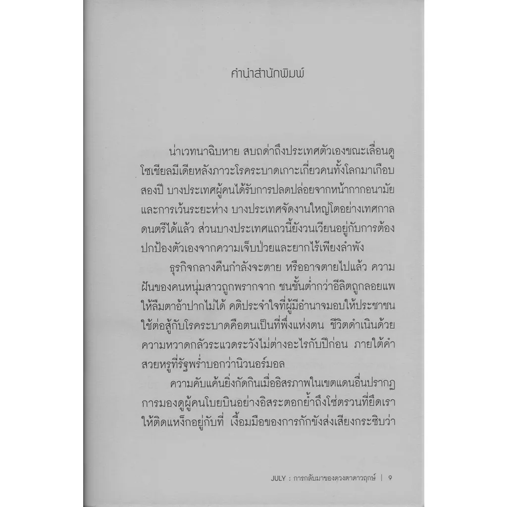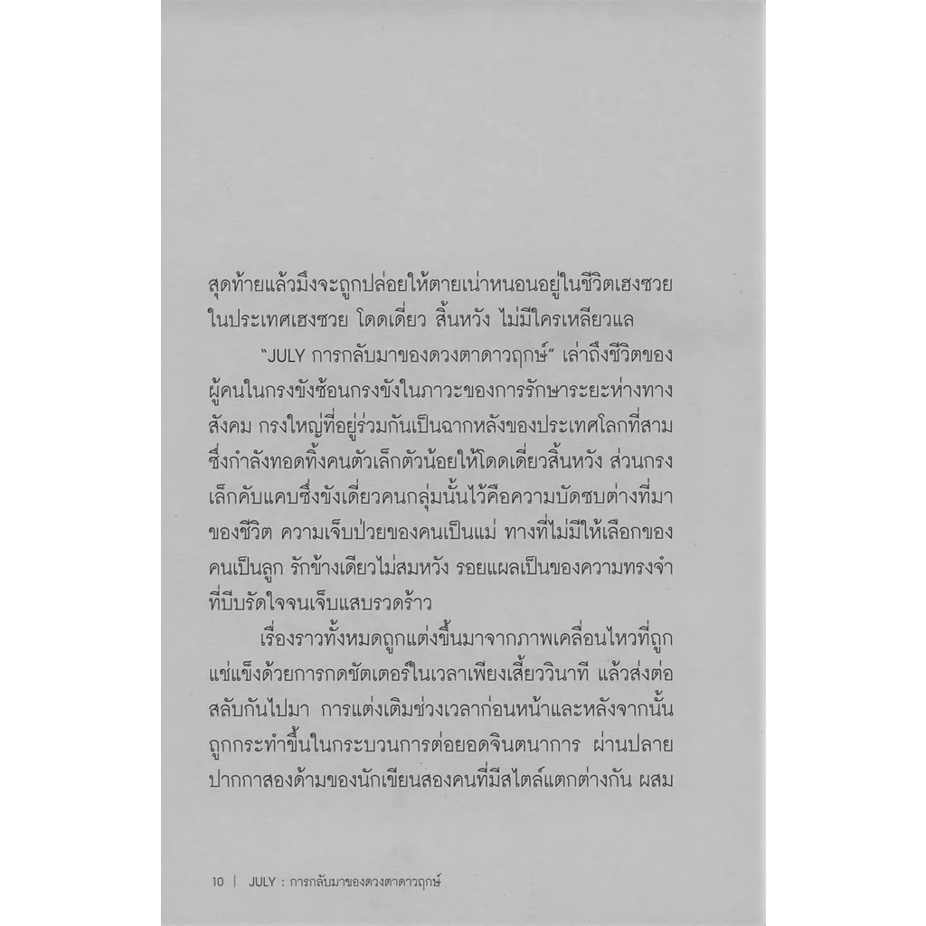 “JULY การกลับมาของดวงตาดาวฤกษ์” รวม 8 เรื่องสั้นจากสองนักเขียน ตินกานต์ และ จรณ์ ยวนเจริญ ที่มีสไตล์ทางภาษาแตกต่างกันอย่างสิ้นเชิง เล่าถึงชีวิตของผู้คนในกรงขังซ้อนกรงขังในภาวะของการรักษาระยะห่างทางสังคม กรงใหญ่ที่อยู่ร่วมกันเป็นฉากหลังของประเทศโลกที่สามซึ่งกำลังทอดทิ้งคนตัวเล็กตัวน้อย ส่วนกรงเล็กคับแคบซึ่งขังเดี่ยวคนกลุ่มนั้นไว้คือความบัดซบต่างที่มาของชีวิต ความเจ็บป่วยของคนเป็นแม่ ทางที่ไม่มีให้เลือกของคนเป็นลูก รักข้างเดียวไม่สมหวัง รอยแผลเป็นของความทรงจำที่บีบรัดใจจนเจ็บแสบ ความฝันของคนหนุ่มสาวซึ่งถูกพราก ความคับแค้นยิ่งกัดกินเมื่ออิสรภาพในเขตแดนอื่นปรากฏ การมองดูผู้คนโบยบินอย่างอิสระตอกย้ำถึงโซ่ตรวนที่ยึดเราให้ติดแหง่กอยู่กับที่ เงื้อมมือของการกักขังส่งเสียงกระซิบว่าสุดท้ายแล้วมึงจะถูกปล่อยให้ตายเน่าหนอนอยู่ในชีวิตเฮงซวยในประเทศเฮงซวย โดดเดี่ยว สิ้นหวัง ไม่มีใครเหลียวแล