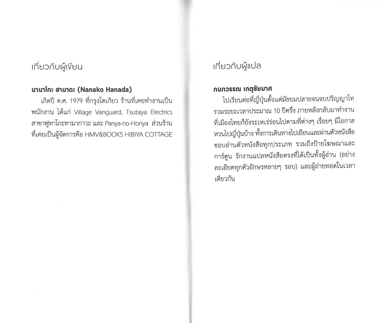 นานาโกะ ฮานาดะ (Nanako Hanada) เกิดปี ค.ศ. 1979 ที่กรุงโตเกียว ร้านที่เคยทำงานเป็นพนักงาน ได้แก่ Village Vanguard, Tsutaya Electrics สาขาฟูทาโกะทามากาวะ และ Panya-no-Honya ส่วนร้านที่เคยเป็นผู้จัดการคือ HMV&BOOKS HIBIYA COTTAGE