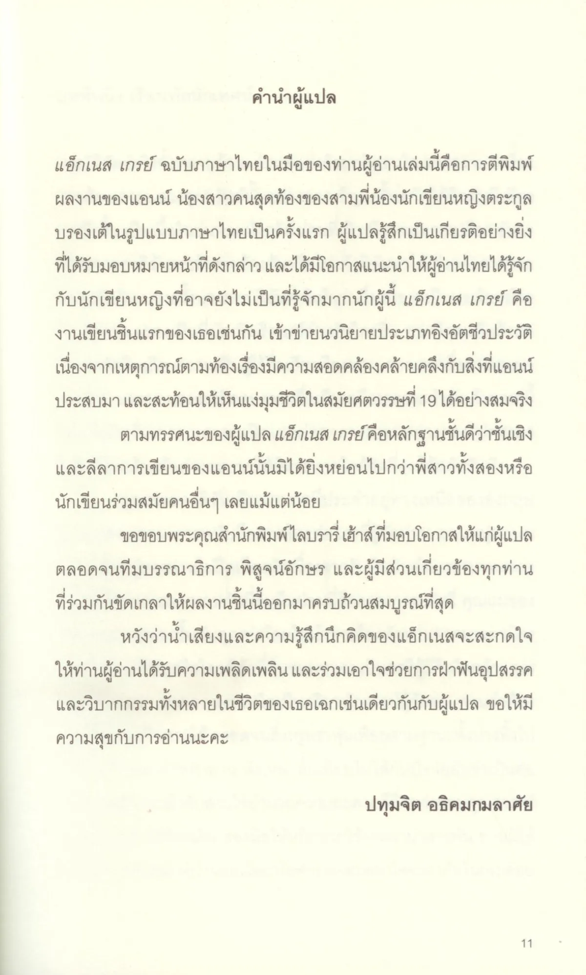 แอนน์ บรองเต้ (1820–1849) นักประพันธ์และกวีชาวอังกฤษ เป็นน้องสาวคนเล็กในจำนวนพี่น้องสามสาวตระกูลบรองเต้ซึ่งล้วนแต่มีผลงานการเขียนนวนิยาย (ชาร์ล็อตต์ และ เอมิลี บรองเต้) แม้ในตอนต้นของเส้นทางการเขียน แอนน์จะอยู่ใต้ร่มเงาและอิทธิพลของพี่สาว แต่ท้ายที่สุดแอนน์ก็พิสูจน์ได้ว่าเธอคือเพชรน้ำเอกอีกคนหนึ่งของโลกวรรณคดีอังกฤษยุควิกตอเรีย แอ็กเนส เกรย์ (Agnes Grey) คือนวนิยายเล่มแรกของเธอ ซึ่งสื่อถึงแนวคิดสตรีนิยม โครงสร้างทางสังคม เศรษฐกิจและการศึกษาของอังกฤษสมัยนั้น รวมทั้งเปรียบดั่งอัตชีวประวัติของแอนน์ เพราะทั้งตัวละครเอกและผู้เขียนล้วนมีอุดมการณ์และประสบการณ์ชีวิตเสมอกัน นั่นคือมีความมุ่งมั่นต่อการเล่าเรียนและยึดอาชีพการเป็นครูประจำบ้าน สอนหนังสือให้แก่บุตรหลานของหลายๆ ครอบครัว แอ็กเนส เกรย์ ตีพิมพ์ครั้งแรกภายใต้นามแฝงว่า แอ็คตัน เบล (Acton Bell) เมื่อ ค.ศ. 1847 ปีเดียวกับวุธเธอริง ไฮตส์ (Wuthering Heights) นวนิยายเพียงเล่มเดียวของเอมิลี จวบจนวันนี้ มนตร์ขลังของวรรณกรรมจากบ้านบรองเต้ไม่เคยเสื่อมคลาย กลายเป็นมรดกทางภาษาและวัฒนธรรมให้ได้ศึกษามาแล้วเกือบสองร้อยปี