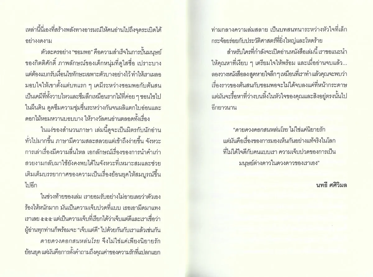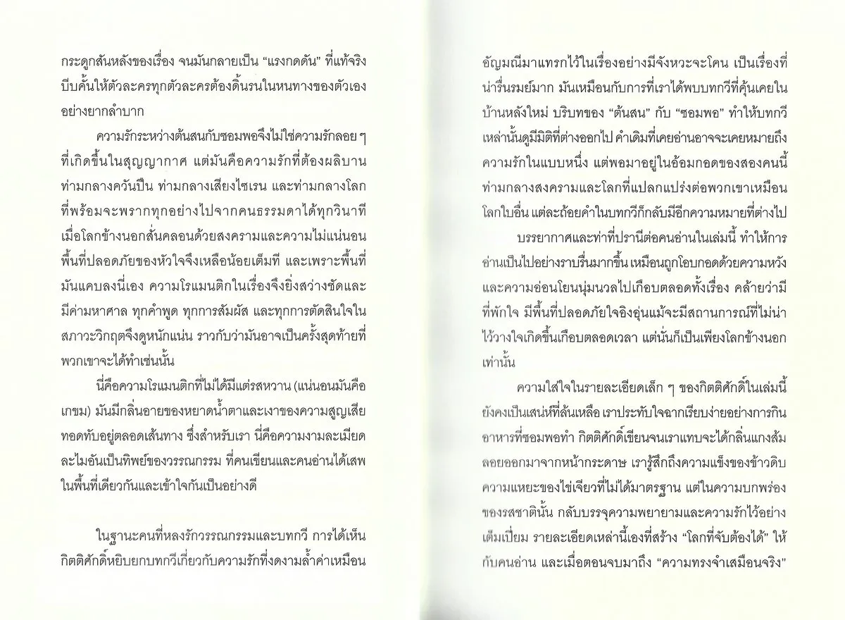 นี่คือความโรแมนติกที่ไม่ได้มีแต่รสหวาน(แน่นอนมันคือเกขม) มันมีกลิ่นอายของหยาดน้ำตาและเงาของความสูญเสียทอดทับอยู่ตลอดเส้นทาง ซึ่งสำหรับเรา นี่คือความงามละเมียดละไมอันเป็นทิพย์ของวรรณกรรม ที่คนเขียนและคนอ่านได้เสพในพื้นที่เดียวกันและเข้าใจกันเป็นอย่างดี