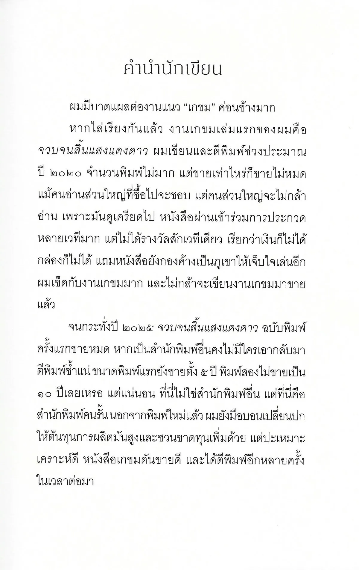 หากไล่เรียงกันแล้ว งานเกขมเล่มแรกของผมคือ “จวบจนสิ้นแสงแดงดาว” ผมเขียนและตีพิมพ์ช่วงประมาณปี 2020 จำนวนพิมพ์ไม่มาก แต่ขายเท่าไหร่ก็ขายไม่หมด แม้คนอ่านส่วนใหญ่ที่ซื้อไปจะชอบ แต่คนส่วนใหญ่จะไม่กล้าอ่าน เพราะมันดูเครียดไป หนังสือผ่านเข้าร่วมการประกวดหลายเวทีมาก แต่ไม่ได้รางวัลสักเวทีเดียว เรียกว่าเงินก็ไม่ได้ กล่องก็ไม่ได้ แถมหนังสือยังกองค้างเป็นภูเขาให้เจ็บใจเล่นอีก ผมเข็ดกับงานเกขมมาก และไม่กล้าจะเขียนงานเกขมมาขายแล้ว
