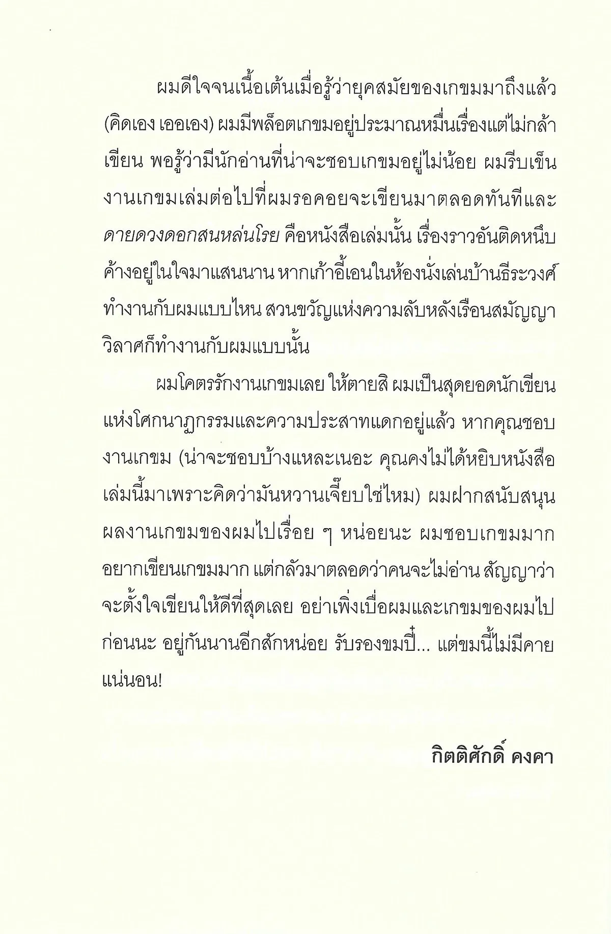 ผมดีใจจนเนื้อเต้นเมื่อรู้ว่ายุคสมัยของเกขมมาถึงแล้ว (คิดเอง เออเอง) ผมมีพล็อตเกขมอยู่ประมาณหมื่นเรื่องแต่ไม่กล้าเขียน พอรู้ว่ามีนักอ่านที่น่าจะชอบเกขมอยู่ไม่น้อย ผมรีบเข็นงานเกขมเล่มต่อไปที่ผมรอคอยจะเขียนมาตลอดทันทีและ “ดายดวงดอกสนหล่นโรย” คือหนังสือเล่มนั้น เรื่องราวอันติดหนึบค้างอยู่ในใจมาแสนนาน หากเก้าอี้เอนในห้องนั่งเล่นบ้านธีระวงศ์ทำงานกับผมแบบไหน สวนขวัญแห่งความลับหลังเรือนสมัญญาวิลาศก็ทำงานกับผมแบบนั้น