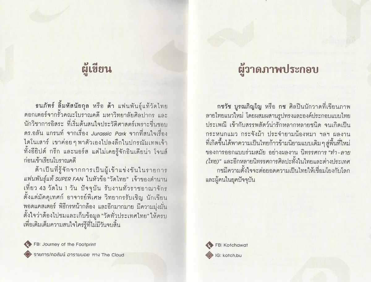 ธนภัทร์ ลิ้มหัสนัยกุล หรือที่เราน่าจะรู้จักเขาผ่านตำแหน่ง “ต้า แฟนพันธุ์แท้วัดไทย” (จากรายการแฟนพันธุ์แท้ SUPER FAN ช่องเวิร์คพอยท์ ) ชวนเราไปลองค้นหาความหมาย ที่ซ่อนอยู่ในเจดีย์ วิหาร จิตรกรรมฝาผนัง พระพุทธรูปต่างท่าทาง (เขาเรียกว่าปางใช่ไหม) ใบเสมา (คืออะไรนะ) ฐานชุกชี (มีไว้ทำอะไรอะ) ทั้งในแง่มุมของฟังก์ชันและบทบาทที่สะท้อนทั้งศิลปะ สถาปัตยกรรม เรื่องเล่า และวัฒนธรรมร่วมของผู้คนแต่ละยุคสมัย