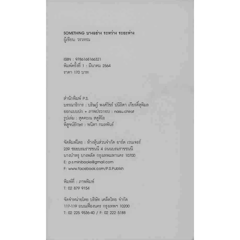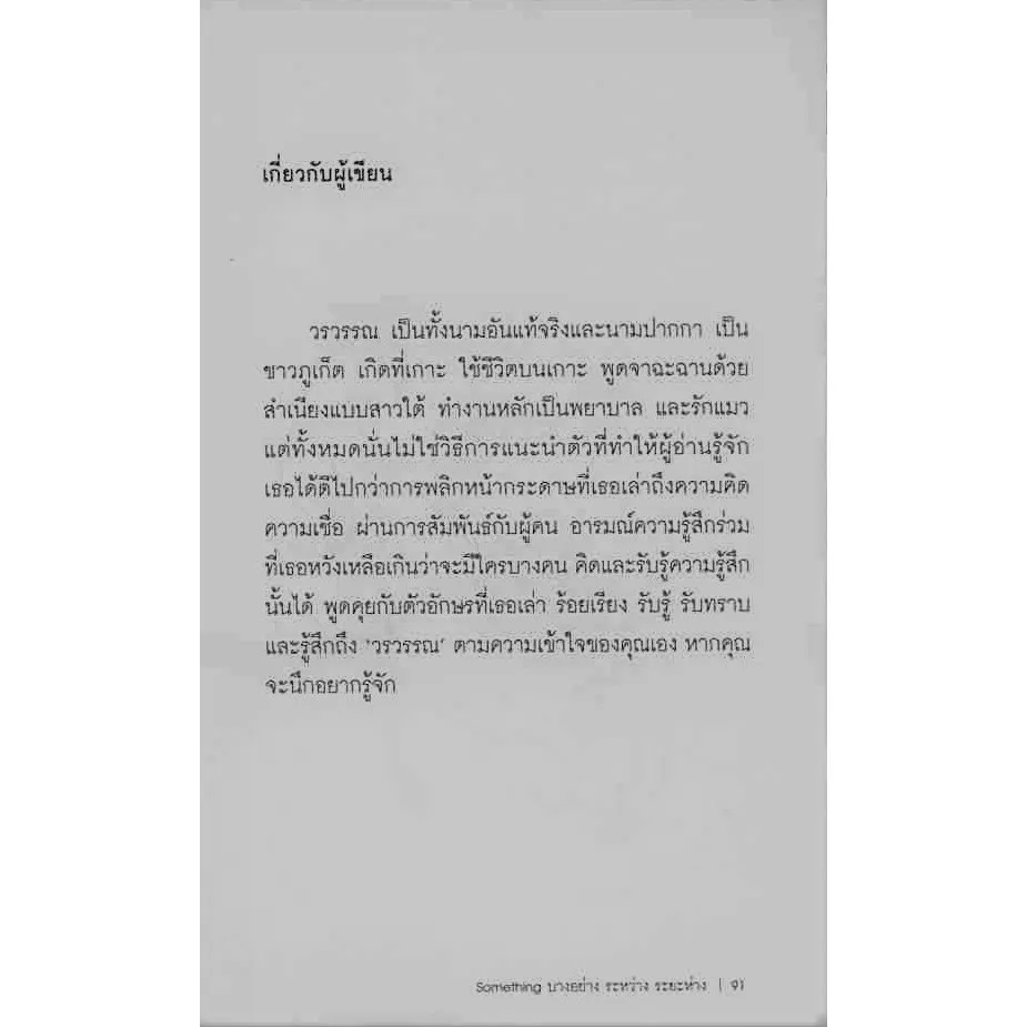SOMETHING IN BETWEEN บางอย่าง ระหว่าง ระยะห่าง คือหนังสือที่ใช้วิธีการเล่าเรื่องในรูปแบบกลอนเปล่า โดย วรวรรณ ถ้อยคำปริมาณไม่มากไม่น้อยเล่าเรื่องราวไม่ใหญ่ไม่โต ด้วยน้ำเสียงของใครสักคนที่กำลังพูดถึงใครอีกคน คุณ/ฉัน/เขา/หล่อน/พวกเขา ประหนึ่งว่าชีวิตกำลังเคลื่อนไหววูบวาบระหว่างพลิกไปในแต่ละหน้ากระดาษ ไร้กรอบแห่งการประพันธ์ ร้อยเรียงอย่างธรรมดาสามัญ เปิดเผยและเข้าถึงง่าย ทั้งการเปล่งท่วงในห้วงรัก การใคร่ครวญยามใหลหลง รำพึงรำพันทบทวนชีวิต ก่อนจะโหมโรงเปลี่ยนแปลงเป็นแรงโกรธขึ้ง กระแสกราดเกรี้ยวที่สั่นคลอนบางห้วงอารมรณ์ บางสิ่งที่บอกเล่าระยะห่างระหว่างสิ่งมีชีวิตในรูปแบบของกลอนเปล่า ไร้กลวิธีซับซ้อน แต่กลับรู้สึกถึงความผุผังจากภายใน ความโกรธโลก ชิงชังในตัวเอง และความซับซ้อนภายในจิตใจซึ่งพยายามจะคลี่คลาย ปลดเปลื้องเงื่อนไขความรัก ชวนให้ไตร่ตรองไปทีละคำ ชวนให้มีส่วนร่วมในการปลดเปลื้องเงื่อนไขความรัก ท่ามกลางสังคมความเป็นประชาธิปไตยเว้นระยะห่างจากเราออกไปทุกที