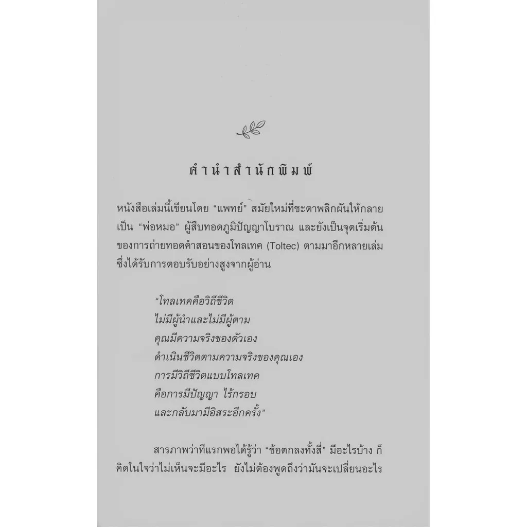 หนังสือเล่มนี้เขียนโดย “แพทย์” สมัยใหม่ที่ชะตาพลิกผันให้กลายเป็น “พ่อหมอ” ผู้สืบทอดภูมิปัญญาโบราณ และยังเป็นจุดเริ่มต้นของการถ่ายทอดคำสอนของโทลเทค (Toltec) ตามมาอีกหลายเล่ม ซึ่งได้รับการตอบรับอย่างสูงจากผู้อ่าน
